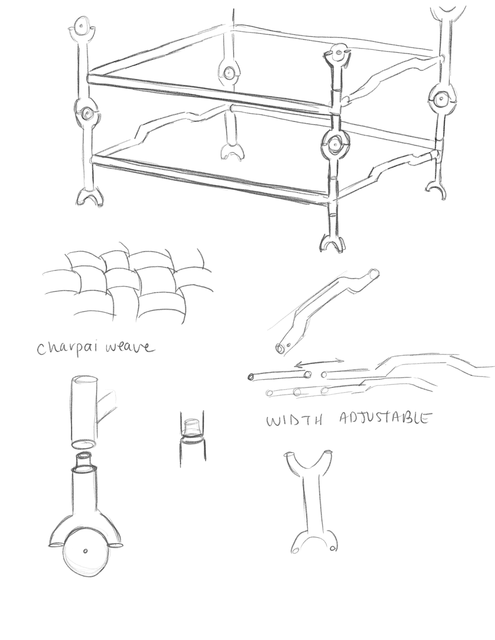 The frame itself is made out of materials the villagers currently use to make their own bed frames. These materials are either metal rods or PVC tubes. Holes are drilled into the tubes to make the bed frame size adjustable with bolts. The cross section of the bed frame utilizes the same method that is used in making chairs, a charpai weave with woven rope.